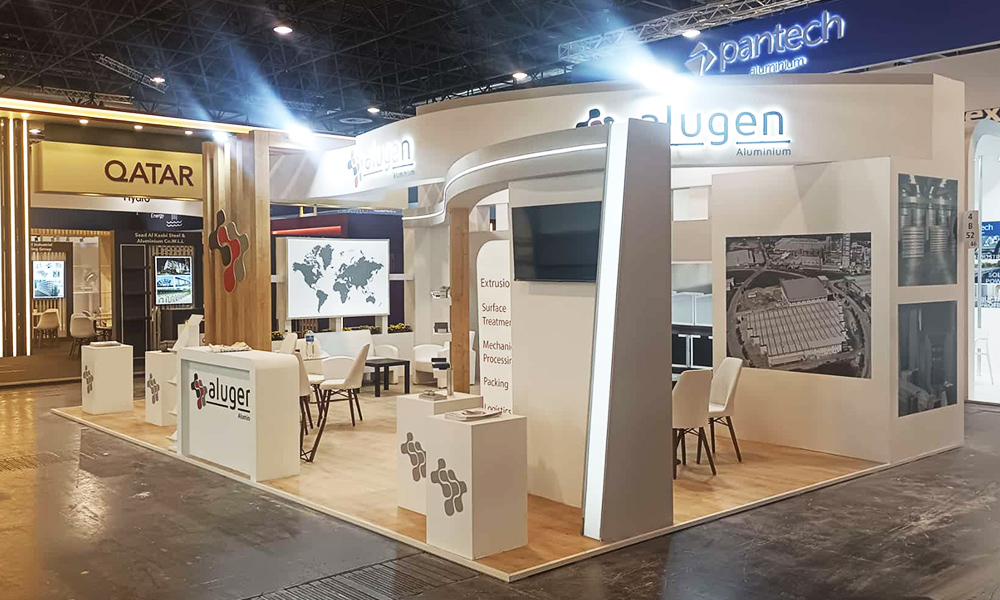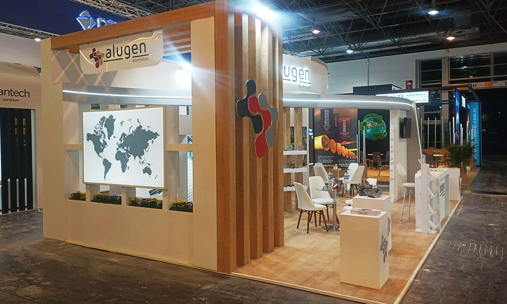 This design, which we made for Alugen Aluminum at the 2024 Aluminum Düsseldorf fairground, is a customizable, disposable wooden custom-made exhibition stand. MDF was selected as the material for the stand construction and painted in the company's corporate colors, and the signage selection was applied as light box letters.