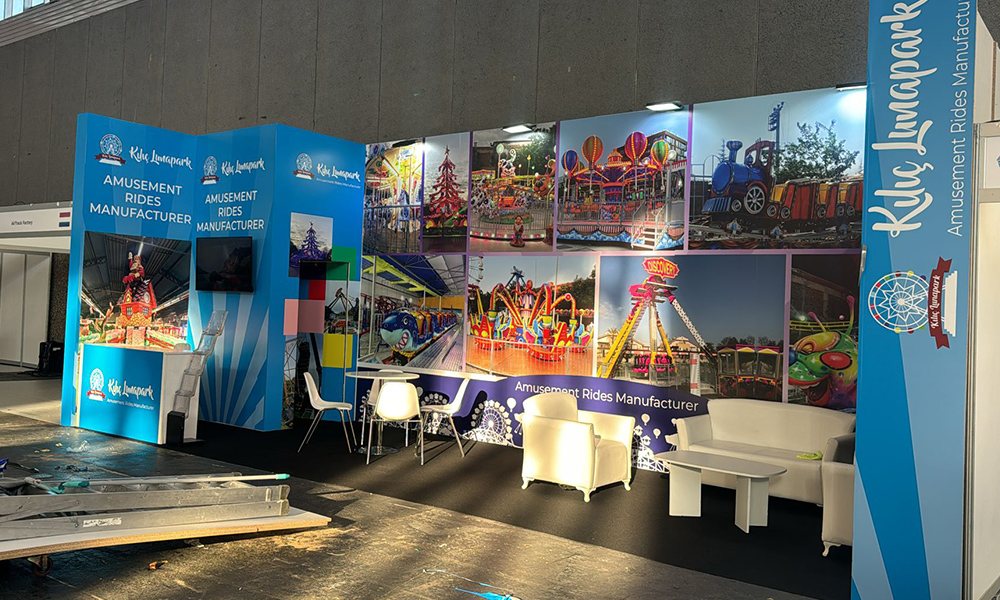 This design we made at the 2024 IAAPA Amsterdam exhibition area is a customizable disposable wooden custom-made exhibition stand. White and sapphire oak MDF was chosen as the material for the stand construction.